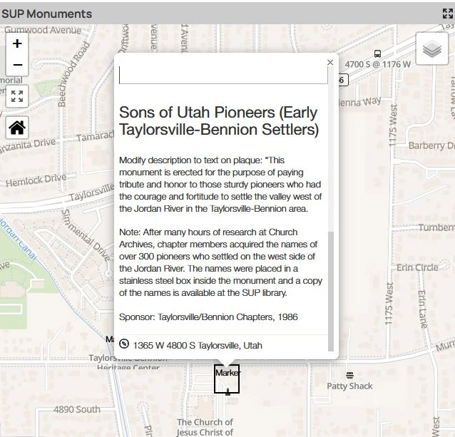 For decades, The Sons of Utah Pioneers have established historical monuments and markers. These markers commemorate trails, events, buildings and persons of historical significance of the pioneers. Additional markers were established by the Utah Pioneer Trails and Landmarks Association, and these are now overseen by the Sons of Utah Pioneers.