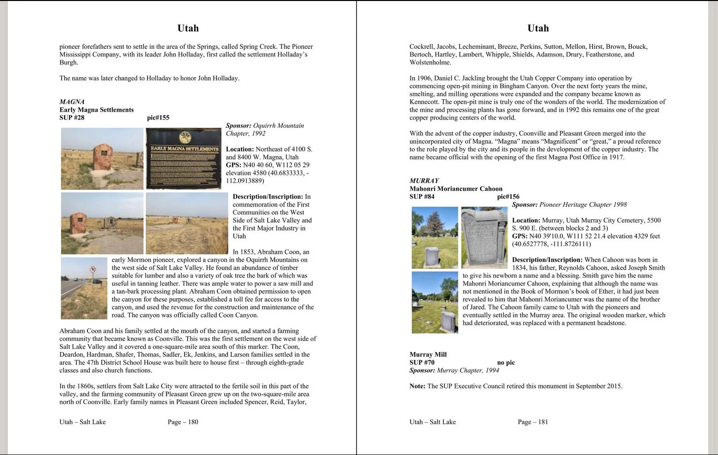 Gratitude is expressed to all those individuals who gave of their time and resources to collect and preserve the history, location and pictures of the monuments associated with the Sons of Utah Pioneers organization. Without their assistance, making of this publication would not be possible. Specific thanks to those who were responsible for researching, providing photographs, texts, location/condition information, and text editing.